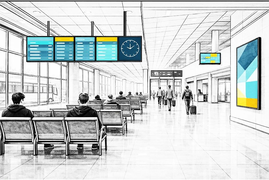 Deliver schedules, service updates, safety messaging, advertising, and passenger information across terminals, waiting areas, and onboard displays.
